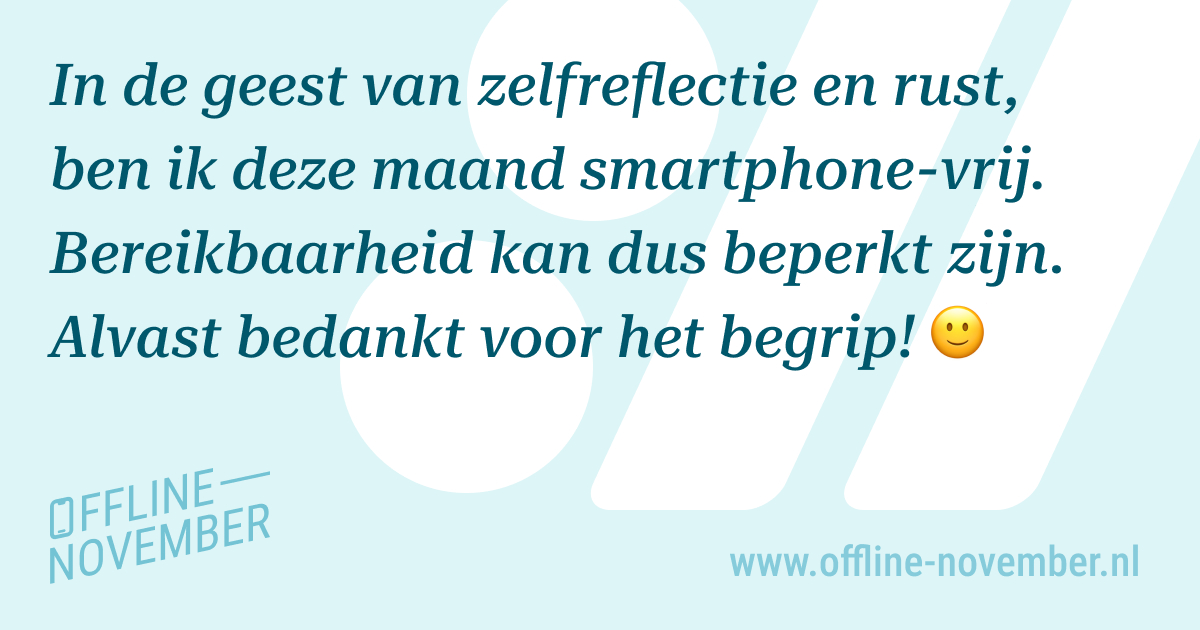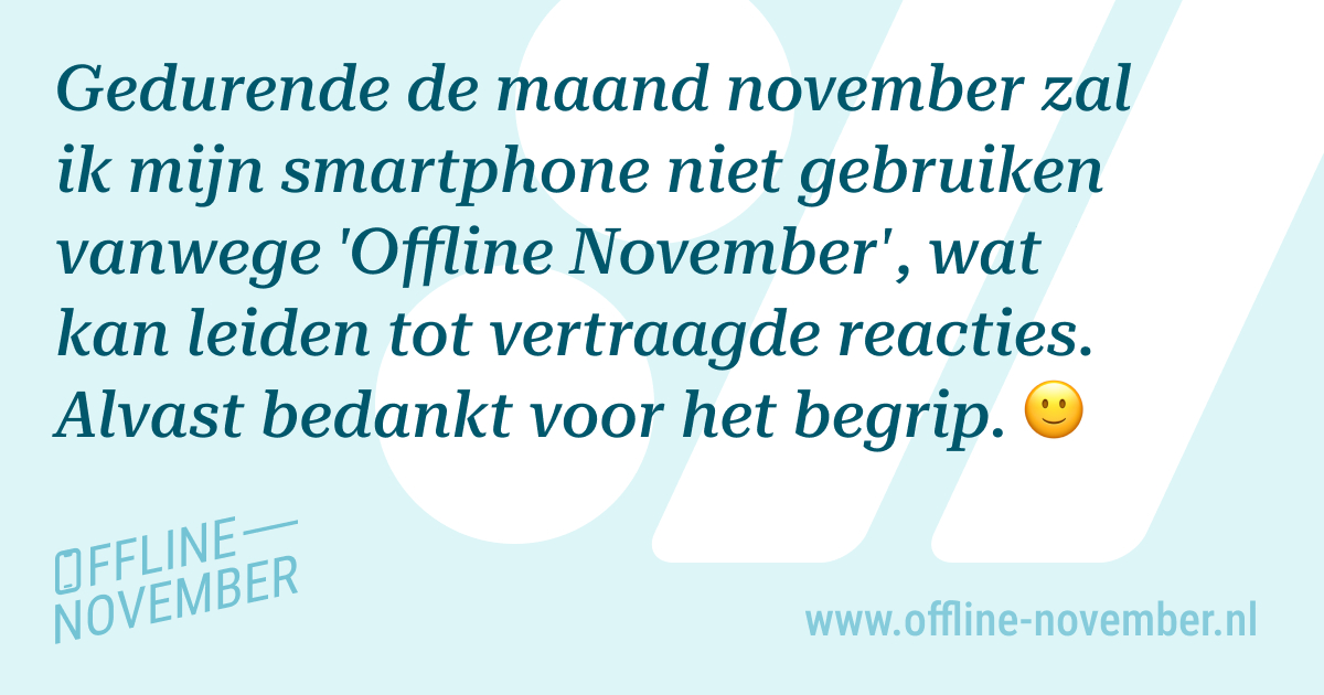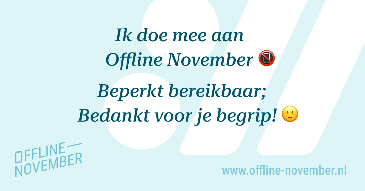 De informatie op deze website heeft niet als doel om medisch advies te verstrekken. Deelname aan Offline November is geheel op vrijwillige basis en op eigen verantwoordelijkheid. Het is van belang om je eigen gezondheid en welzijn te beoordelen voordat je besluit deel te nemen hieraan.